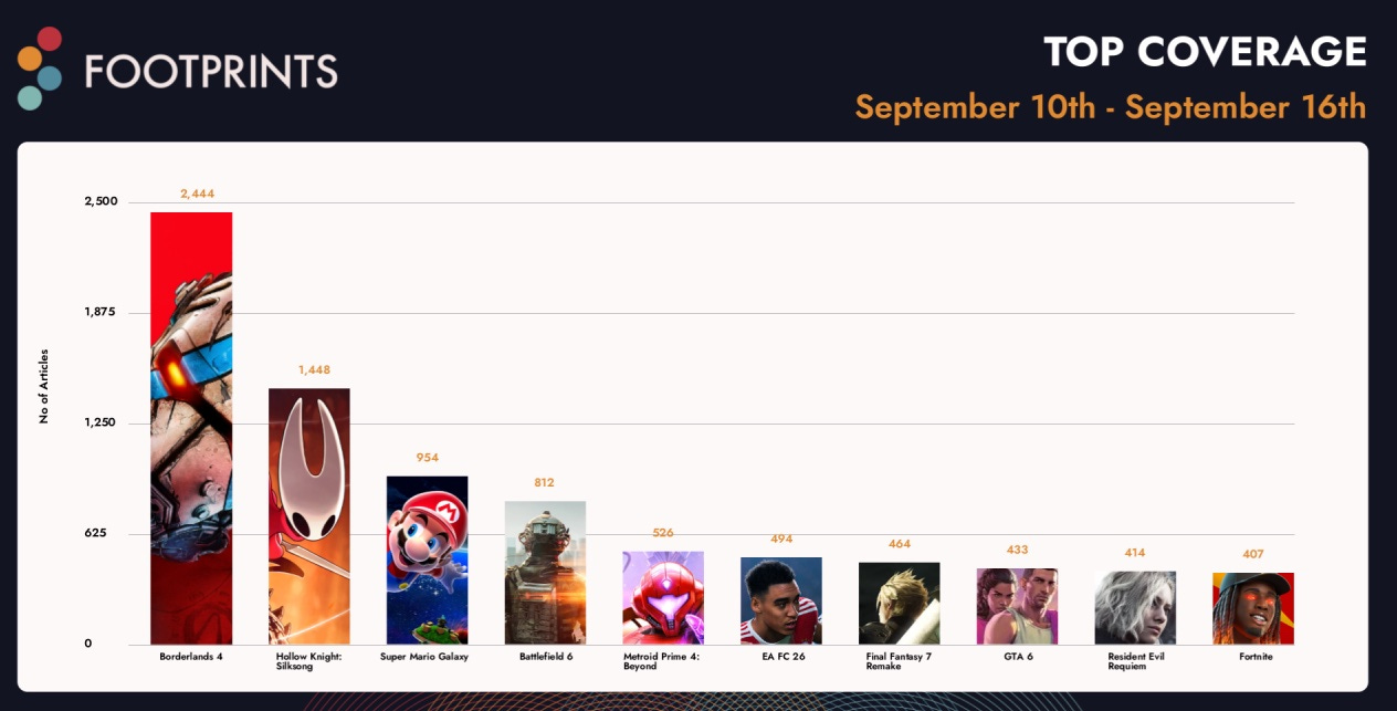 The latest Footprints.gg ‘trad media’ coverage chart includes a lot of Borderlands 4 discussion - ‘aided’ by PC performance issues & a certain tech support ‘helper’. Also charting: Silksong (again), Super Mario Galaxy (due to the upcoming remaster), Battlefield 6 (again again!), Metroid Prime 4 (finally dated), and more.