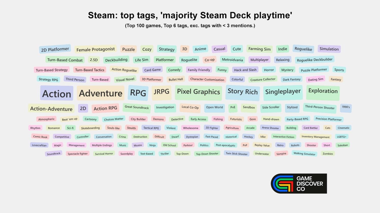 There’s definitely a ‘lite console’ vibe in here, right? And for an alternative review, here’s the Top 6 Steam tags of any kind for each of the Top 100 games with the most ‘majority Steam deck playtime’, excluding seldom-mentioned tags: