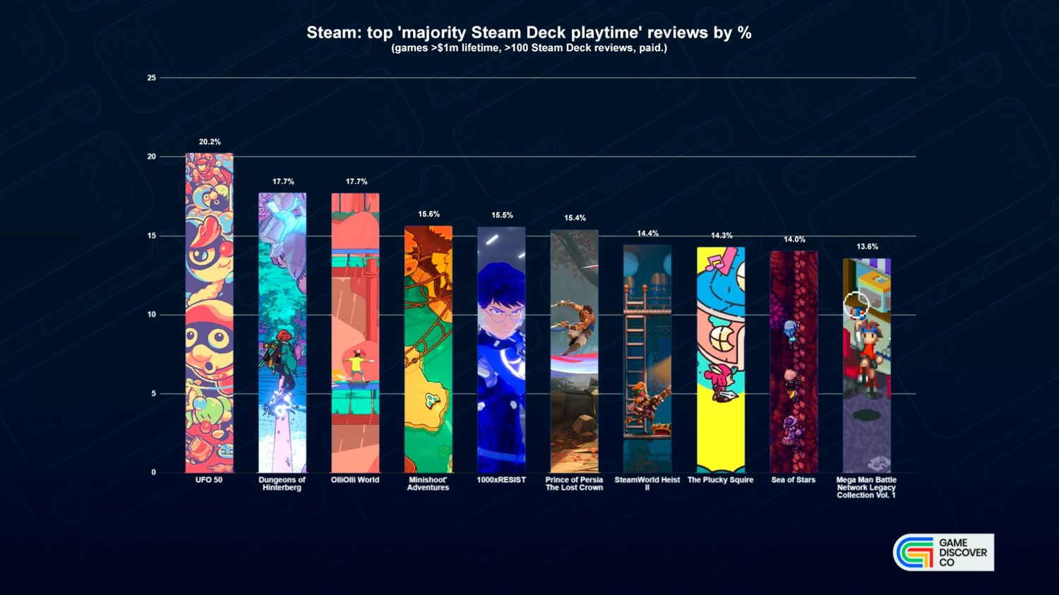‘Imaginary game console catalog’ UFO 50 is #1, with 20.2% of its reviews from >50% Deck players. And the Zelda-ish Dungeons of Hinterberg (#2, 17.7%) and the cartoony, skateboard-tastic OlliOlli World (#3, 17.7%) are also high up the list.