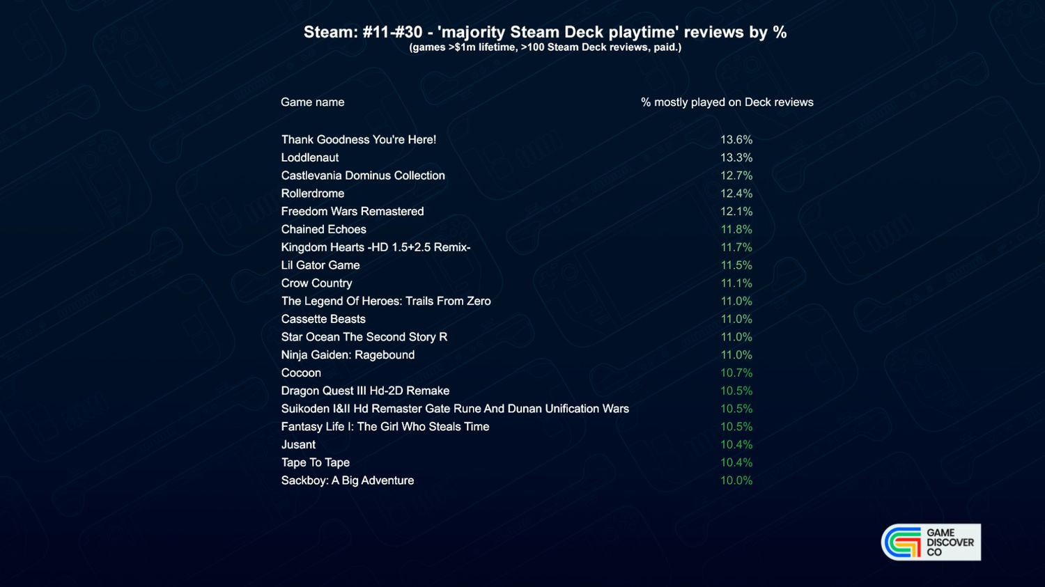 This time around, we’re taking a different approach, and looking across all games that grossed >$1m lifetime on Steam and have >100 ‘>50% played on Steam Deck’ reviews. (Here’s the source spreadsheet, if you want to look around.) Here’s the Top 10 by the highest % of reviews that are majority Steam Deck in ‘hours played’: