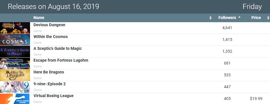 Anyhow, back to exemplifying. Let’s take Within The Cosmos, which has 1,600 Steam followers and is launching on Friday, August 16th. Perhaps it adds a few more followers by its launch hour. Even so, via Jake’s basic formula this implies it should sell just over 4,000 copies in its first week - and perhaps 20,000-25,000 copies in the first year, but not all of those at full price. Not bad! Not bad? (Depends on how much it cost, if there’s other platforms, etc.)