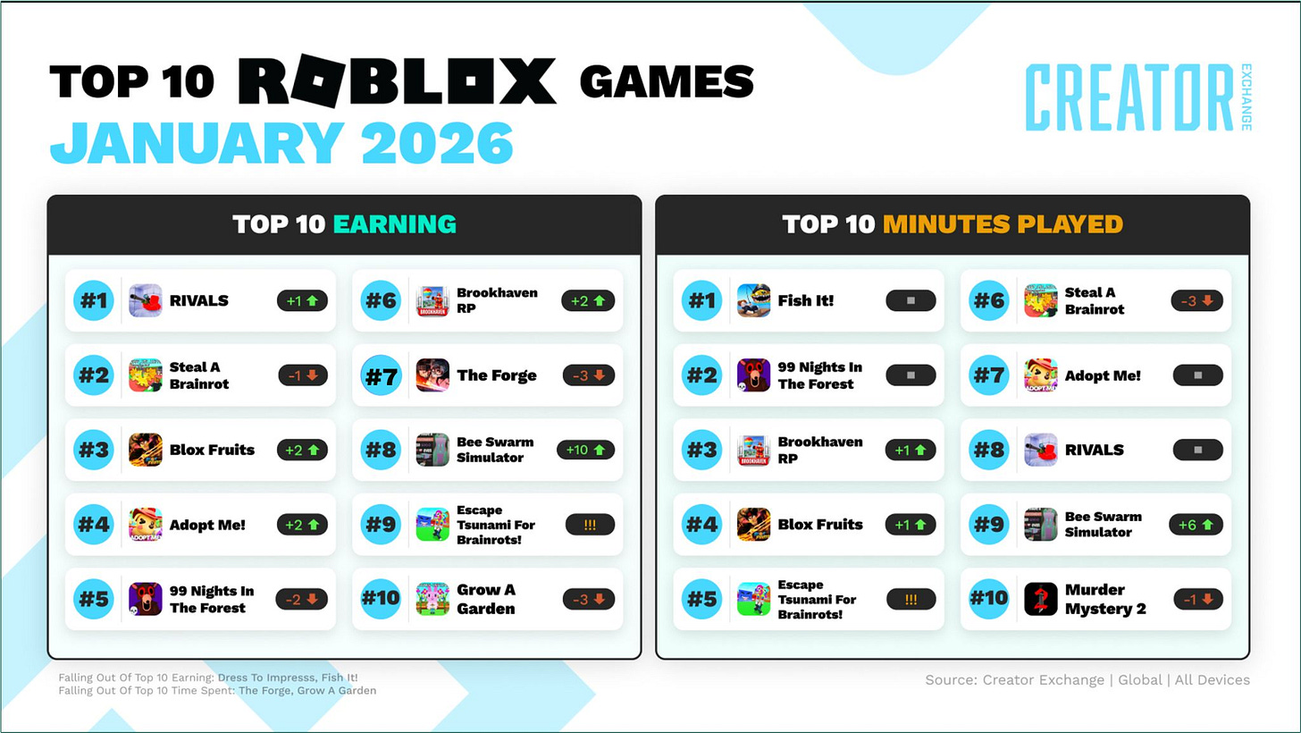 Finally, a quick look at Jan 2026’s top-earning Roblox charts (above), as documented by David Taylor at Creator Games. And you’ll see plenty of the obvious folks in top-earning (Rivals, Steal A Brainrot, Blox Fruits, Adopt Me!), but that one notable new entry - Escape Tsunami For Brainrots.