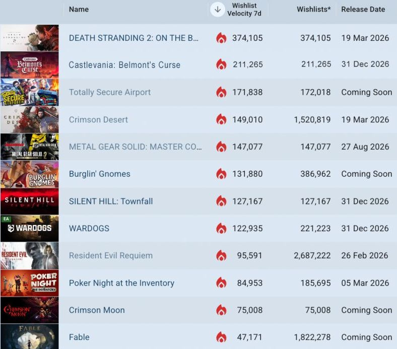The latest unreleased trending Steam games, according to GameDiscoverCo Pro’s 7-day wishlist charts (Feb 10th-17th), shows Hideo Kojima's Death Stranding 2 (already ~2m on PS5, GDCo estimates!) confirm PC and hit #1. Also PlayStation showcased? New 2D franchise addition Castlevania: Belmont's Curse (#2).