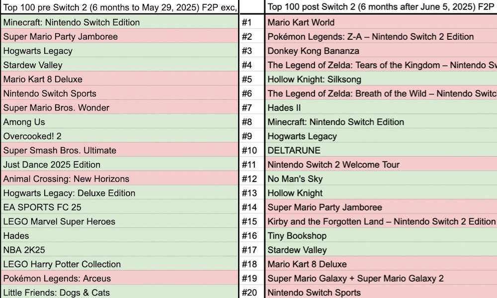 There’s definitely no smoking gun in here - different games are popular because of the Switch 2, and we’d expect that. (And there are seven first-party games in the Top 20 before, and 11 after. But again, Switch 2 means new platform exclusives & upgrades.)