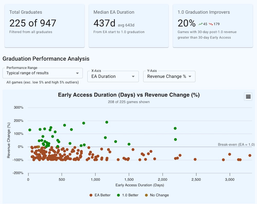Of the 225 Steam games emerging from Early Access, only 20% (45) did better at 1.0 than they did at Early Access. 180 or so games did worse.