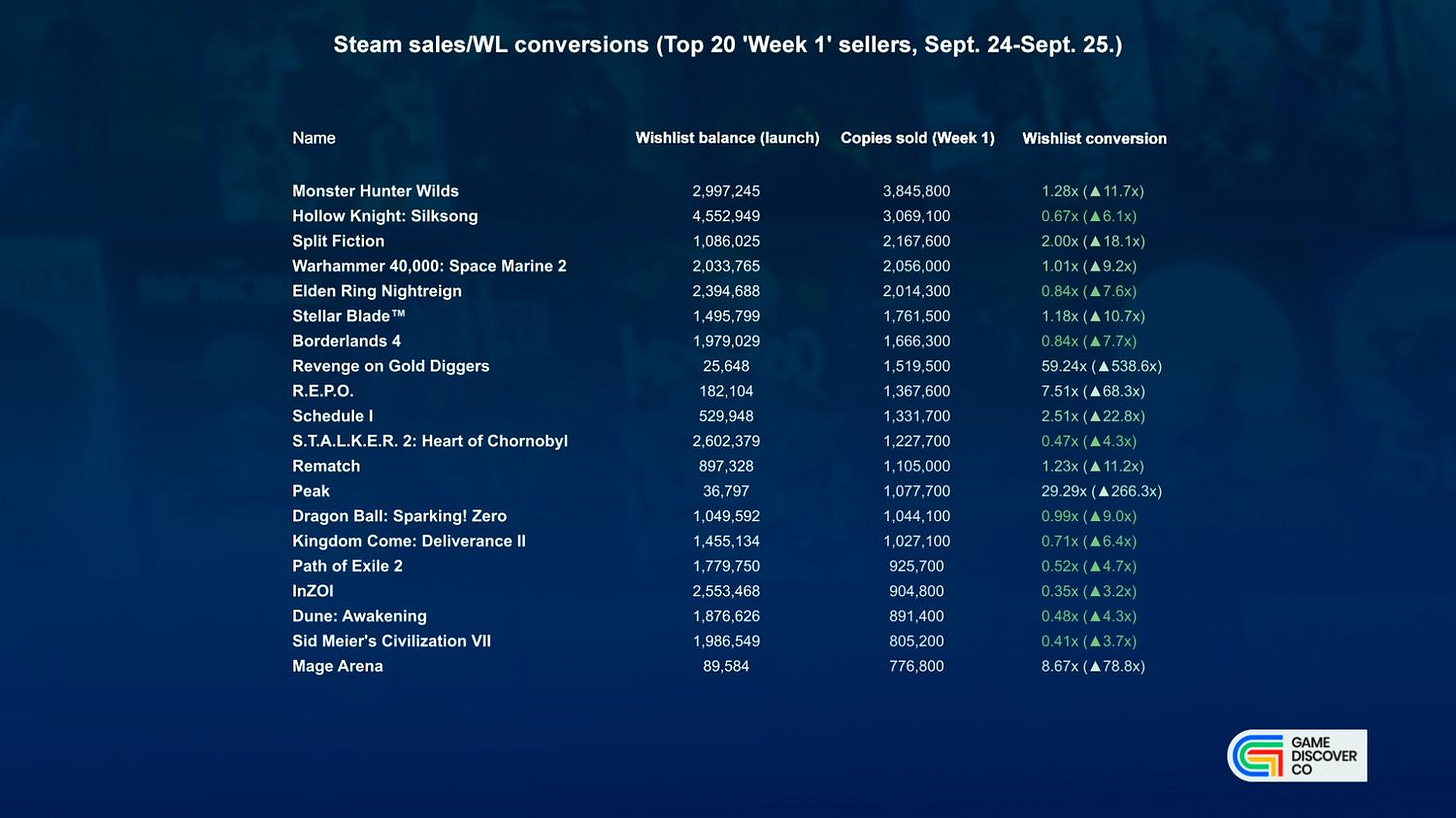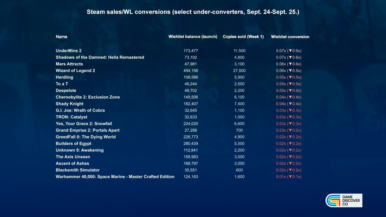 To start off: yes, we’re aware that the idea of wishlist ‘conversions’ on Steam as some kind of reliable metric is near-fatally flawed. Why? Because the performance range of ‘wishlists at launch’ compared to ‘sales at the end of Week 1*’ varies by 10-20x, not 10-20%. (*We’re including both ‘purchases from wishlist’ and organic purchases in this number.)
