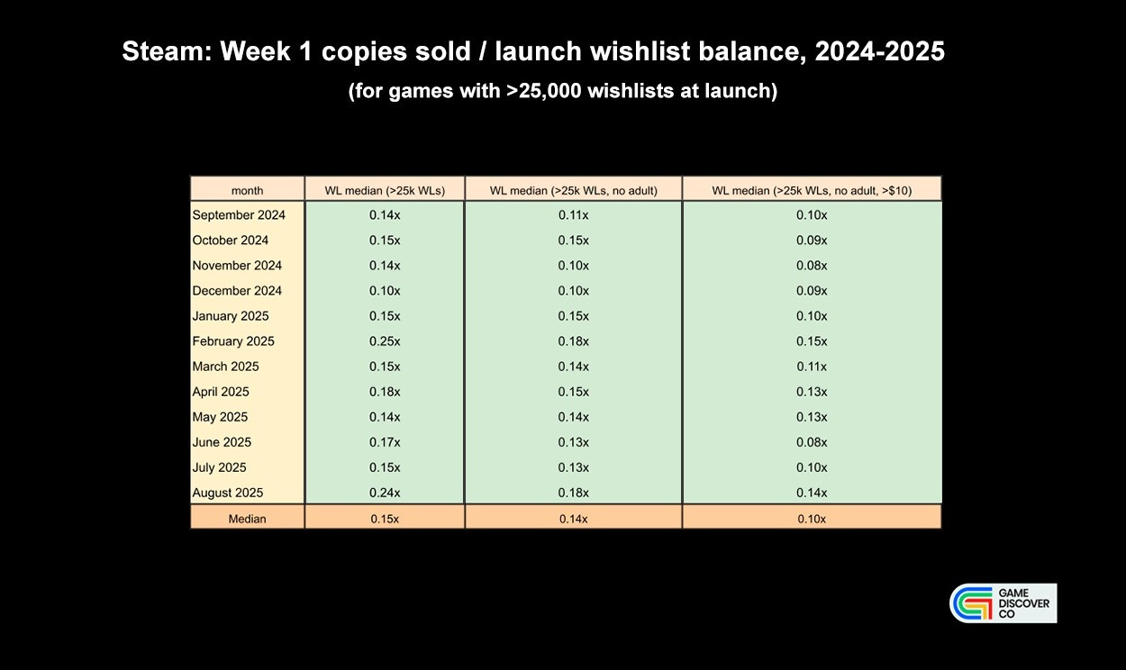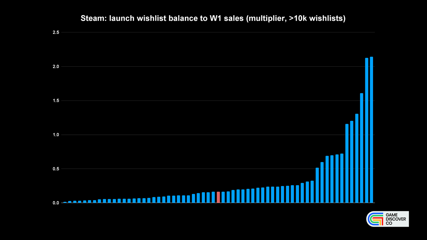 We’ve covered this a few times, and here (above) were the results of an anonymous publisher/dev poll we did in 2024. The median was 0.17x if you launched with >10k wishlists (so: 50k wishlists, 8,500 total sales at end of Week 1), but it was as low as 10% of that, and as high as 10x that. So…. that’s great for your forecasts, huh?