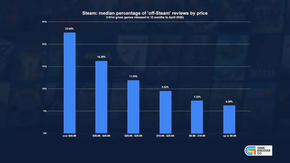 Overall, the median number of off-Steam reviews is around 12% for the entire cohort. You’d probably expect that if people were selling Steam keys via third-party stores and giving out keys to influencers who might end up reviewing, etc.