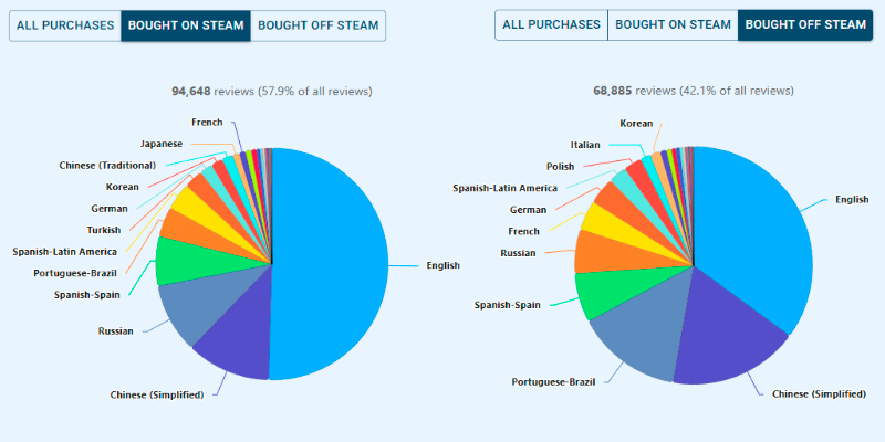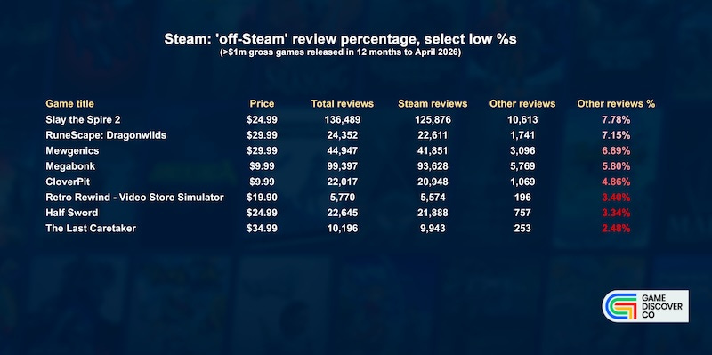 Of course it’s possible that off-Steam purchases are sold to demographics that over-review, or there’s a lot of promo/review keys sprinkled in. So we can’t take these numbers as gospel. But they’re indicative, at least.
