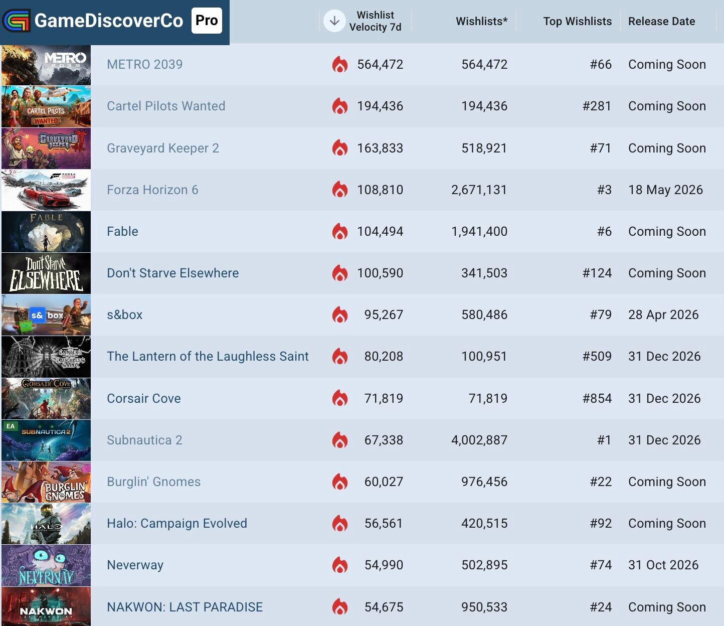 GameDiscoverCo's 'trending' unreleased Steam games - by 'new wishlists in the last 7 days', April 13th to 20th - has quite a few new entries & is led by post-apocalyptic shooter sequel Metro 2039 (#1), and shortform viral sensation Cartel Pilots Wanted (#2) - everyone wants to be lawless drugrunners nowadays, pshaw.
