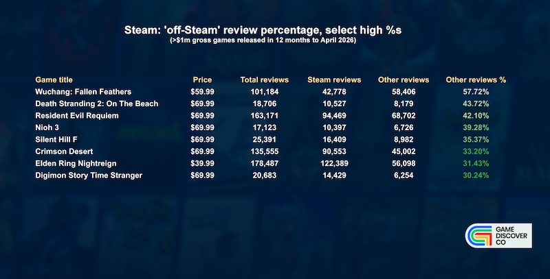 To give you an idea of where the keys might be going, here’s GDCo’s split of ‘on Steam’ vs. ‘other’ reviews for Resident Evil Requiem, still 18% cheaper off-Steam. There’s lots of Chinese and Portugese-Brazilian language keys helping the 42% off-Steam review total: