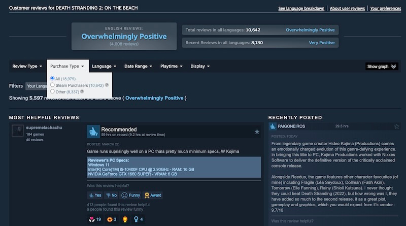 Let’s start with the facts on Steam review counts, using the example above for Death Stranding 2, because it got complicated recently: