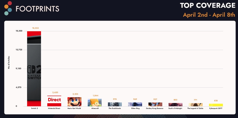 Looking at Footprints.gg’s top ‘trad media’ mentions for April 2nd-8th, wow, there’s some Switch 2 dominance - it had >18k articles, 9x the #2 subject. Of games featured in the Switch 2 reveal, the order of interest was Mario Kart World, The Duskbloods & Elden Ring (FromSoft rules?), then Donkey Kong Bananza.
