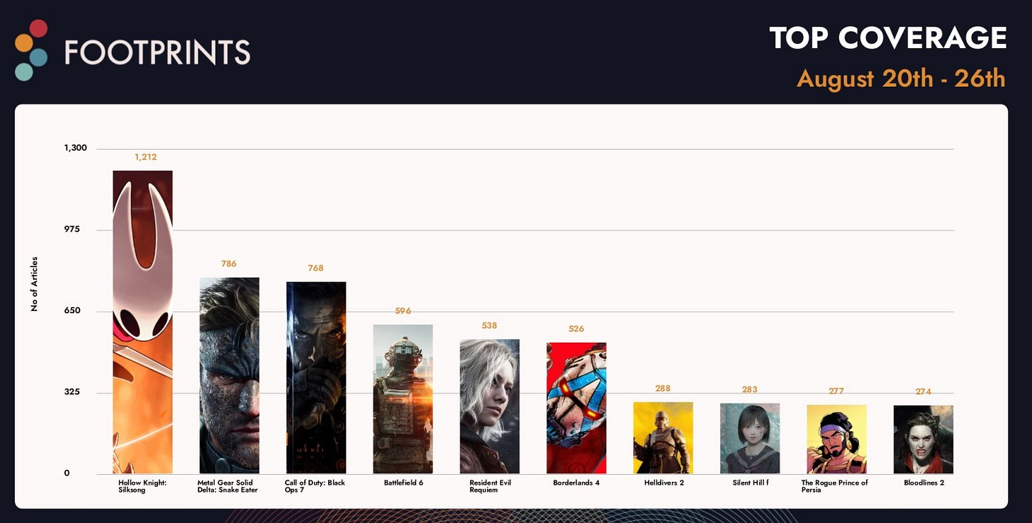 The latest Footprints.gg ‘trad media’ mentions chart has a lot of Gamescom and new title-related hype, headed by Hollow Knight: Silksong (duh), MGS Delta: Snake Eater, Black Ops 7, Battlefield 6, Resident Evil Requiem and Borderlands 4 crowding the top of the charts. (Franchise, franchise, franchise!)