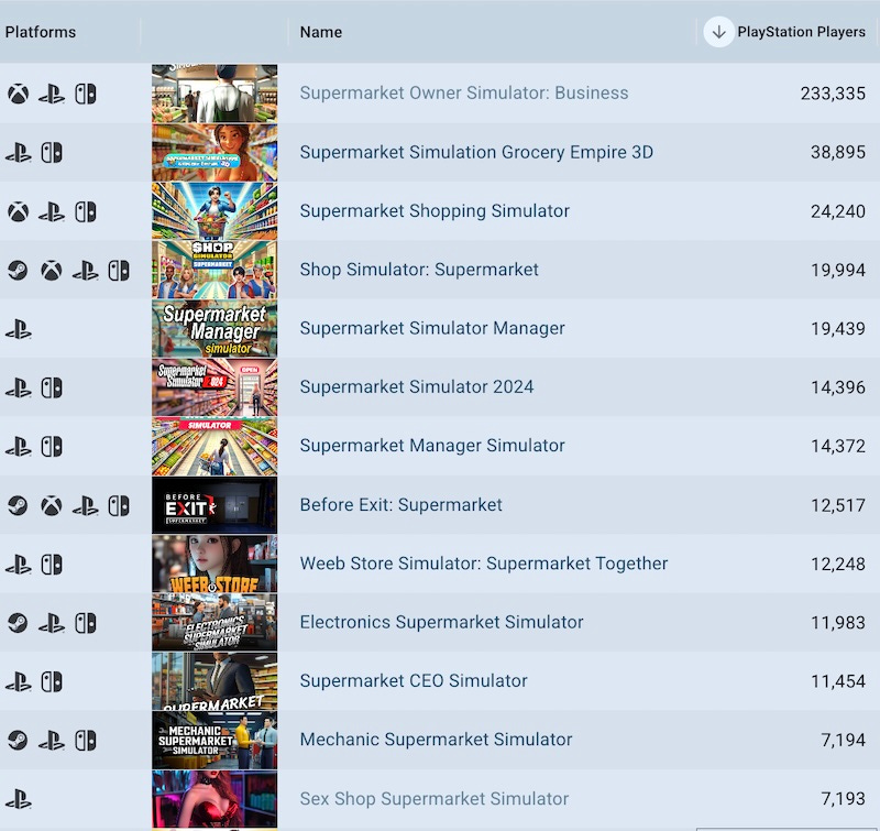 The ultimate ‘winning’ tactic here (if you’re semi-predatory) is to have the top result for a super-popular game which isn’t yet available on the platform. Example #1: a whooole bunch of devs jumped on after Supermarket Simulator lacked a PlayStation version, according to GameDiscoverCo estimates: