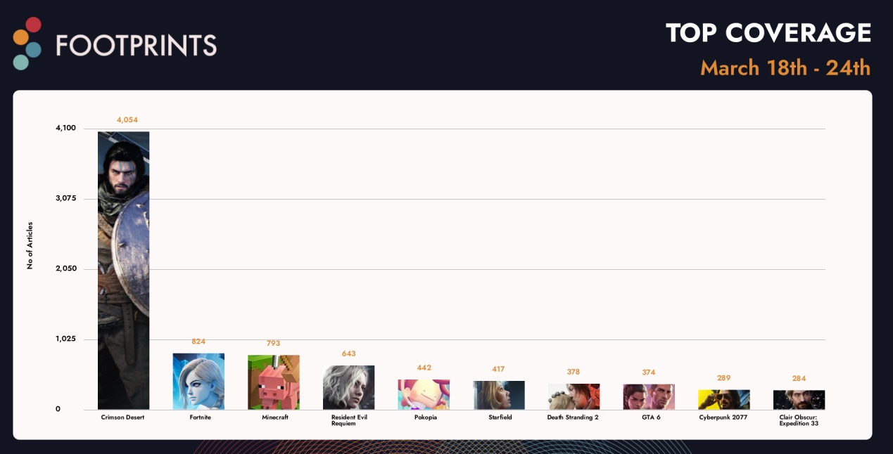 The latest estimates on weekly ‘trad media’ mentions from ICO’s Footprints.gg (above) have epic ARPG Crimson Desert way ahead at #1 (as it hits 3m sold & players start to warm to it.) Also trending: Fortnite (new season, Epic layoffs), Minecraft (the Minecraft Live event announcements), and Res Evil Requiem.