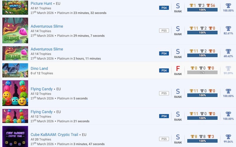 This final issue is around ‘achievement hunters’ who play on PlayStation, are willing to buy games inexpensively, and then easily rack up a Platinum Trophy for getting all the achievements. Above is the top player on PSNProfiles, who has 18,600 completed games & today Platinum-ed Flying Candy in 5 seconds (PS5) and 21 seconds (PS4). Jeez.