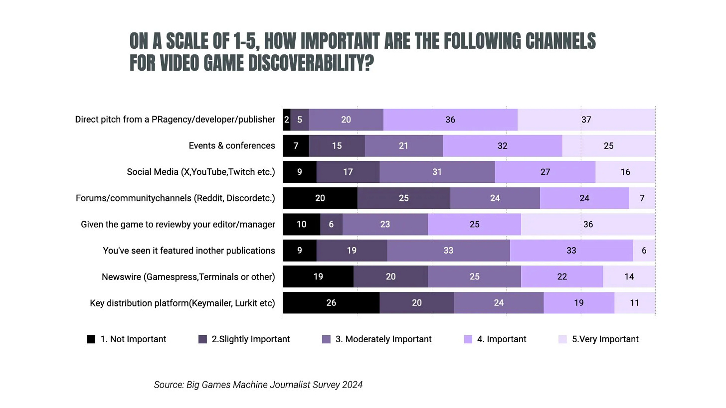 This survey - which is excellent and you should read in depth - is a ‘state of their business’ overview. But it also has some very useful data - such as the above chart - on how video game writers discover content to write about.