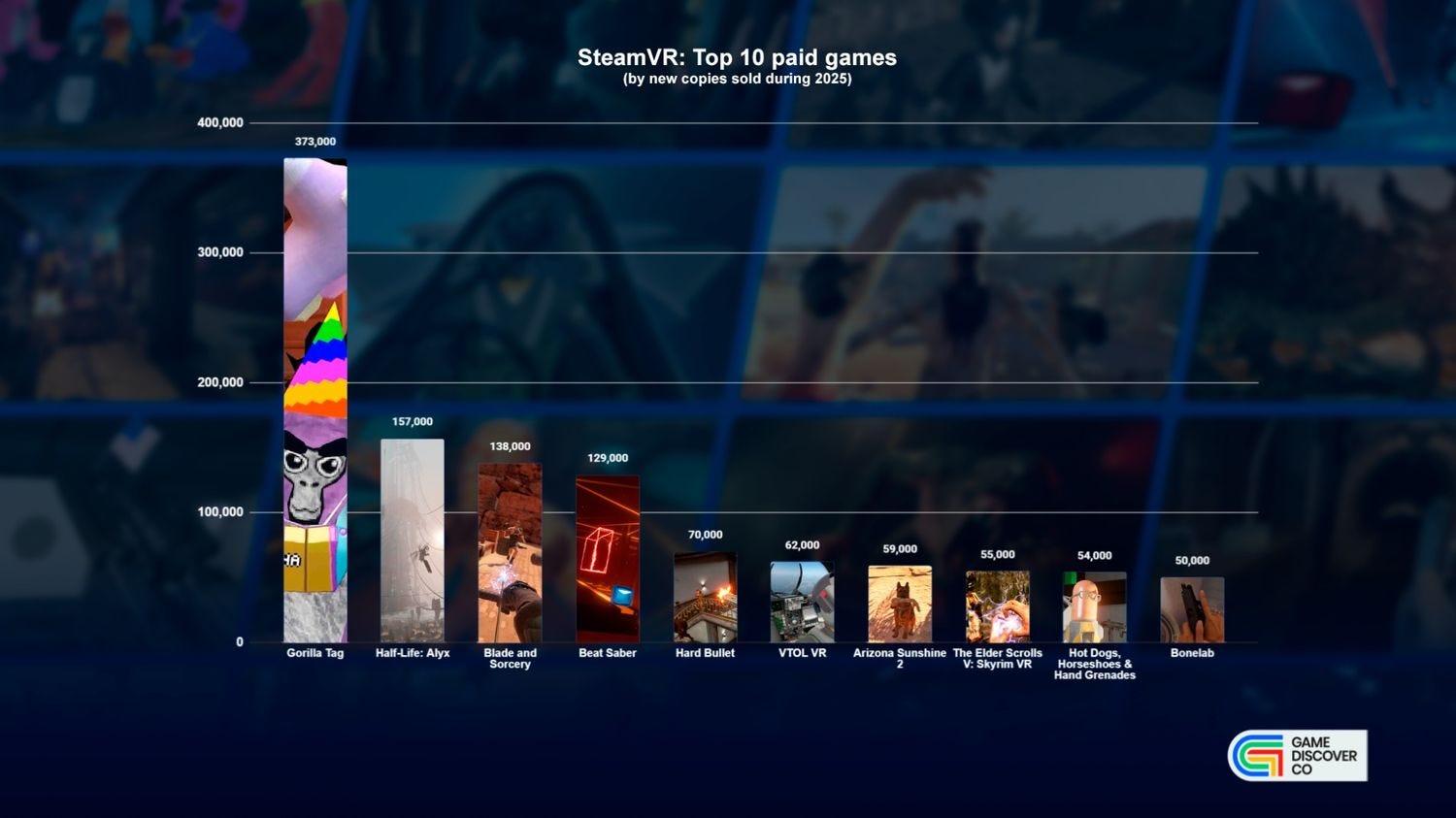 And if we filter Steam releases by ‘VR-only’ games across all of 2025, we get the following GDCo estimates, with only four paid titles selling >100k copies (including Gorilla Tag, which is a $20 game on Steam):
