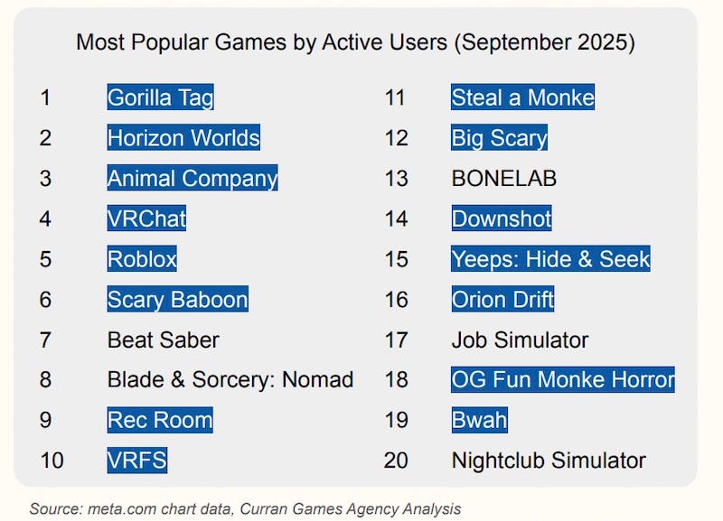 That may be disappointing or delightful. But it’s clear that most new games not in the sim, sports, shooter or simian genres have been selling a few thousand units at best on paid VR release in 2025. That doesn’t cover the complex 3D spatial dev needed for VR. (Why? The younger mass audience are happy enough in free, sandbox worlds.)