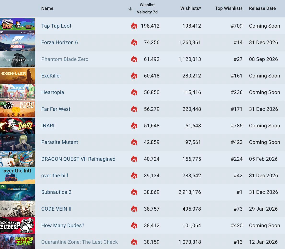 Notably, GDCo Pro’s ‘trending wishlist counts for unreleased Steam games’ chart for Jan 5th-12th are headed by some hot ‘usual suspects’ (Forza 6, Phantom Blade Zero) & another Bongo Cat user-incented title (Tap Tap Loot), but the Cyberpunk-y ExeKiller (#4) got a new gameplay trailer which really boosted interest.