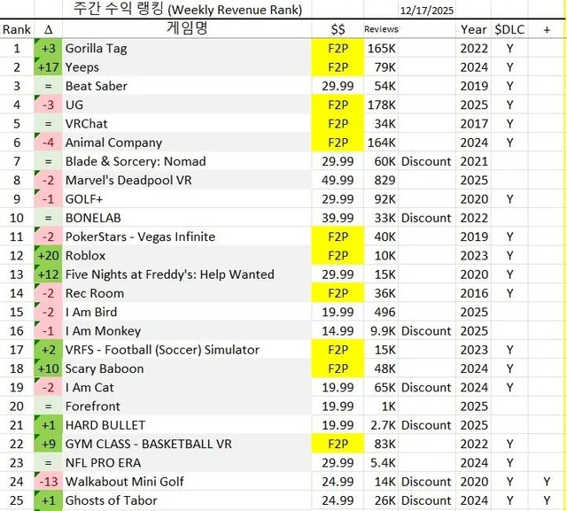 One thing that not everybody has spotted is that Meta has relatively transparent web charts for the Quest (by far the biggest VR market by share!), including top-grossing games for the week and most-played apps for the week. Reddit user AkiaDoc has been compiling these into a weekly spreadsheet and posting screenshots on Reddit. Here’s a ‘top revenue’ example from Dec. 17th which gives you a general idea of the ‘vibe’: