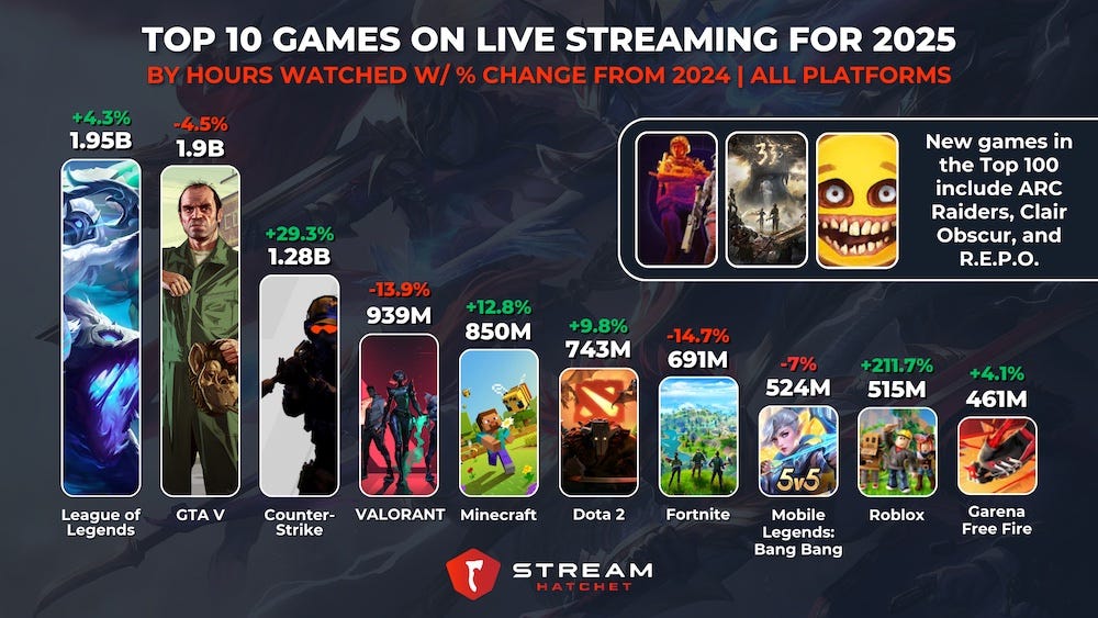 Finally, livestream analytics platform Stream Hatchet did get us the Top 100 most-streamed games for Dec. 2025 (Google doc), but honestly, not much big was happening, besides Path Of Exile 2 getting a 36x watch boost to #15, thanks to a new expansion.