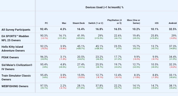 The biggest overindexes of Switch players are for the cozier Hello Kitty Island Adventure (45%) and Webfishing (38%), with Train Sim players (13%) underindexing on almost everything non-PC. Oh, and Madden players try iOS games a lot more, we’re guessing ‘cos the U.S. is a heavy iOS country.
