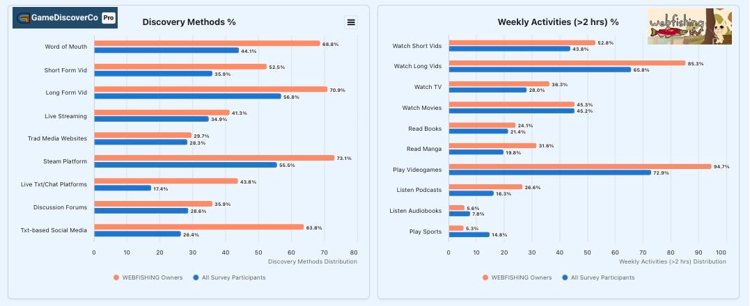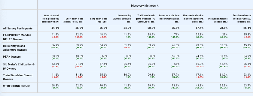 Here’s our question about the main ways people find out about games. Webfishing is a big overindex (69%!) on ‘word of mouth’, and short-form video usage for discovery varies by >2x across different types of game. There’s also interesting differences in usage for Steam as a platform, trad media sites, Discord/Slack, and more.