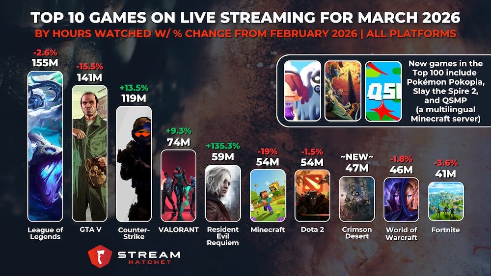 Res Evil Requiem, Crimson Desert make strong Top 10 appearances: Requiem “soared to #5 this month with 59m hours watched”, per Mark, who says: “as a non-live service, non eSports game this is some outstanding viewership”, and notes it also had 25m hours watched in late Feb. Crimson Desert (#8, 47m hours) also did great.