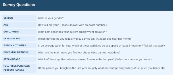 It is a large, increasing survey of core Steam game fans: incenting players via giveaways & other methods, we’ve got ~10,000 initial survey responses to 8 initial questions, and plan to scale response #s to 5-10x that over time.