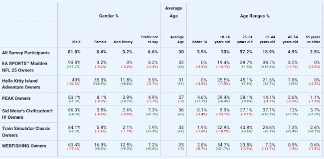 What’s interesting here? Well, gender-wise, Hello Kitty Island Adventure skews as low as 49% male. But these games also ramp as high as 93.5% male (Madden NFL 25), with the average on Steam Fan Snapshot being just over 80% male.