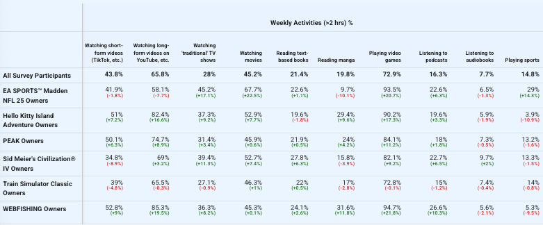And for this question, we thought we’d ask about what activities people did every week, in addition to playing video games! The big headline here is: Madden players do sport(s), and Webfishing players don’t? (Kidding - that’s probably not the big headline.)