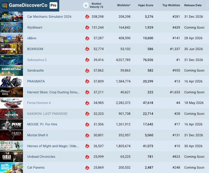 GameDiscoverCo's latest trending unreleased Steam games by 7-day new wishlists is headed by Car Mechanic Simulator 2026 (#1 with >200k wishlists), following up CMS 2021 (which sold >2.4m units.) And Wyldheart (#2) is a co-op fantasy ARPG with "bite-sized campaigns" ft. strong visuals and interest.