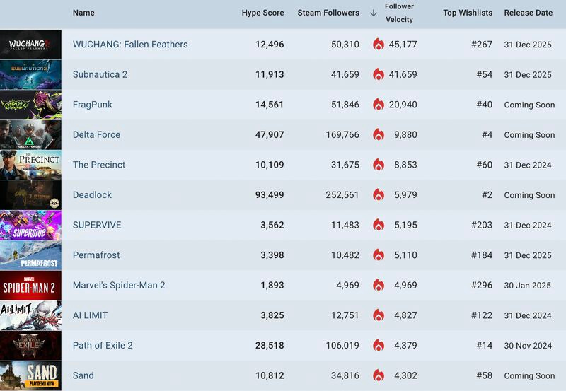 Sure, there’s quite a few Next Fest games in GDCo’s ‘biggest gainers in the last 7 days by Steam followers’ charts, but new trailer for the Black Myth-ish Wuchang: Fallen Feathers (#1) skyrocketed interest in China, and the official announce for Subnautica 2 (#2) also zoomed up the charts. Oh, and there’s Spider-Man 2 for PC!