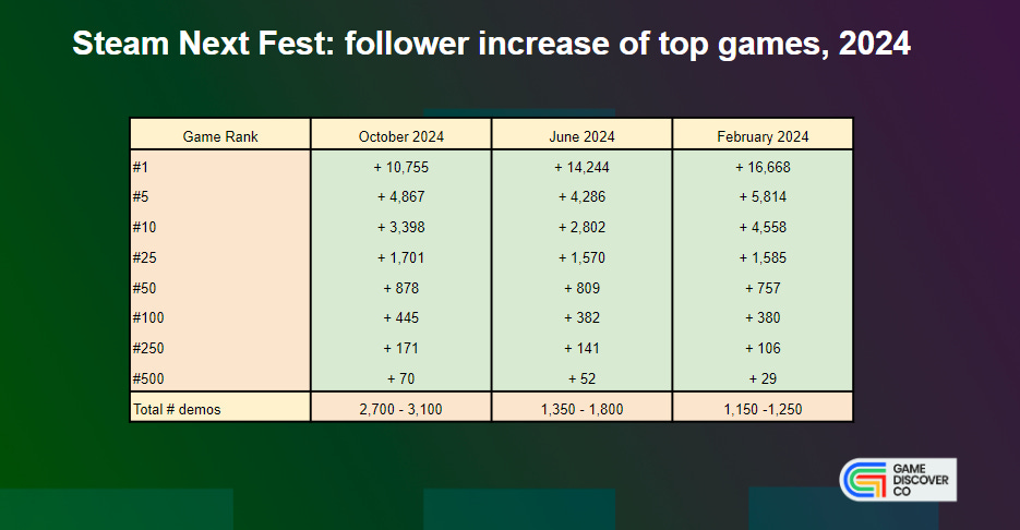 It’s the week after the week before! Thus, GameDiscoverCo returns. So, we’ve been tracking Steam Next Fest demo showcases for a few editions - here’s our pieces from June 2024, February 2024, October 2023, June 2023, and February 2023, if you missed ‘em. And our lead story this week is a look at October’s jampacked Next Fest.