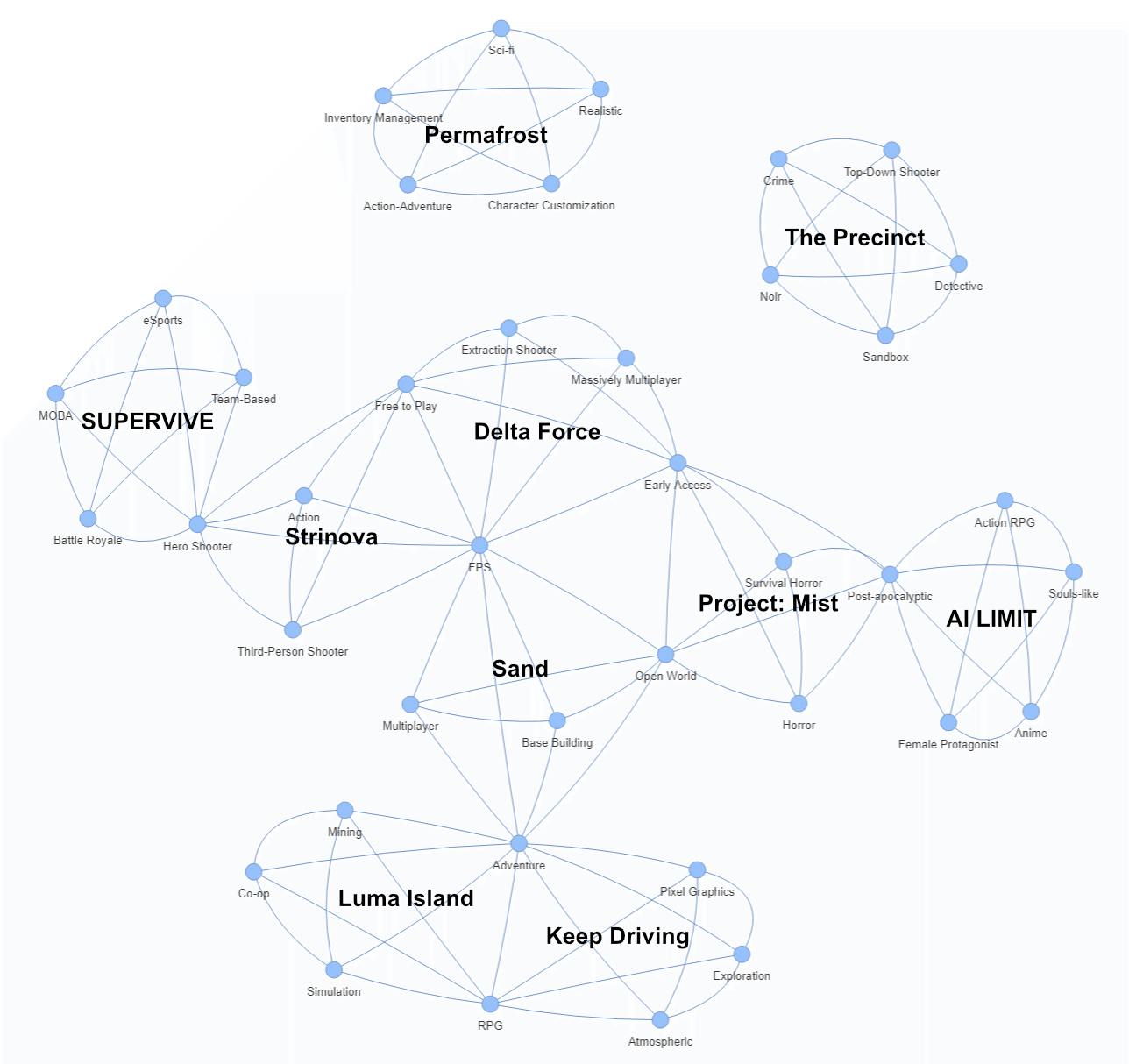 To show this off, here’s the Top 5 tags for each game in this Top 10, plotted for us (kindly!) by AccelByte’s Michael Chan. One of the only big tag overlaps? FPS: