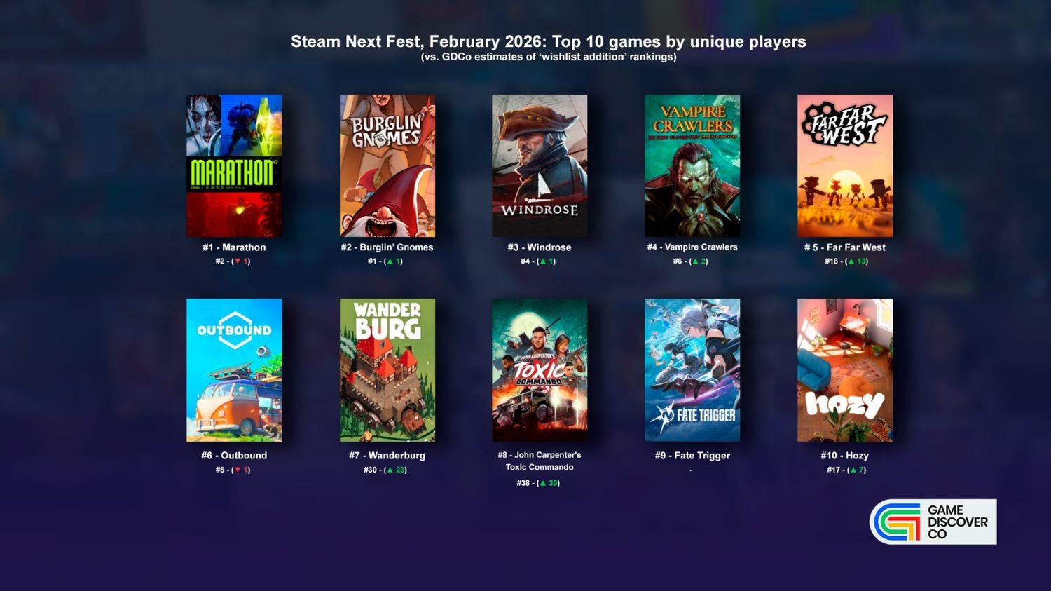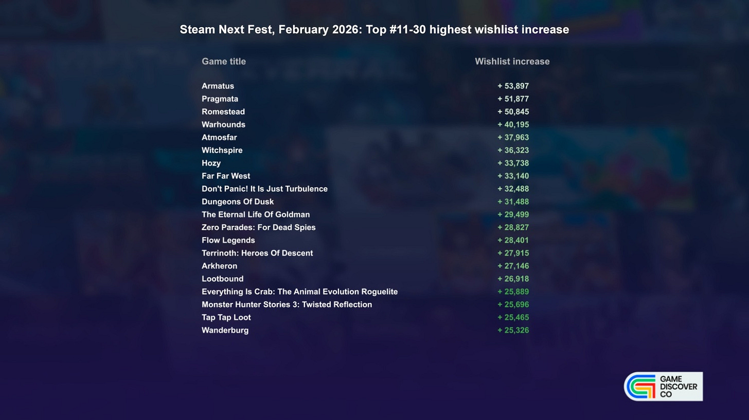 Before we start, Valve’s Top 50 demos of Next Fest - listed sequentially by unique players - is a great kick-off point, since it gives you a strong flavor to add to our super-detailed data on every single Feb. 2026 Next Fest demo (Google Drive doc) we’ve once again pulled.