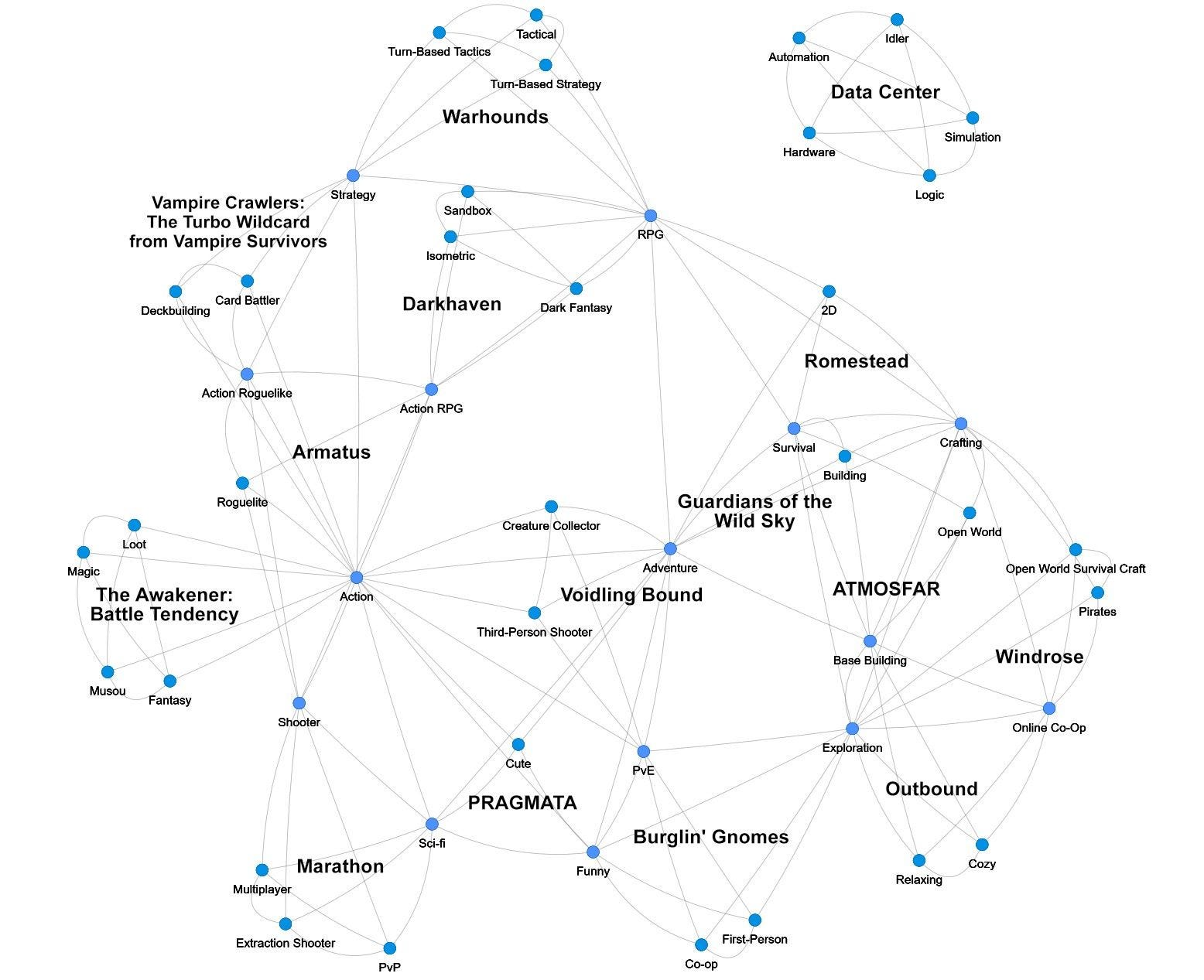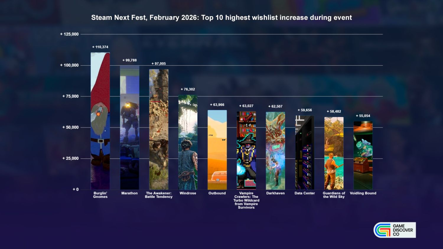 Also notable in here: Diablo-y open-world isometric ARPG Darkhaven (#7) is one of thirteen games we estimate got >50k more wishlists, as did ‘build your own data center’ automation game Data Center (#8), previously GDCo-covered airship survival title Guardians Of The Wild Sky (#9), and monster tamer x shooter (!) Voiding Bound (#10).