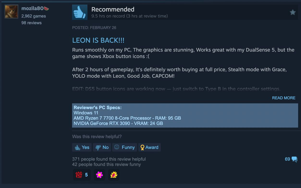 As I posted over on LinkedIn, the PC debut of Resident Evil Requiem is a “good opportunity to see Steam's new 'show my tech specs' box in action within player reviews… in this example, a player is saying the game runs smooth on his machine, and you can even _see_ his machine specs.” Smart idea by Steam, huh?