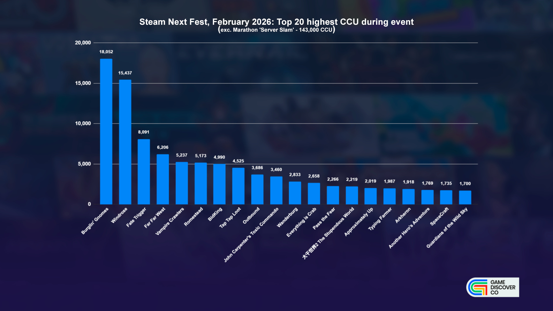 Next let’s come to concurrents. Here’s the Top 20 demos by top CCU during Next Fest, minus Marathon. (Because its 143k CCU would have royally screwed up the chart axes.) We saw three games (inc. Marathon) get >10k CCU, and seven get >5K CCU - all of which we’ve discussed already, except anime hero shooter Fate Trigger.