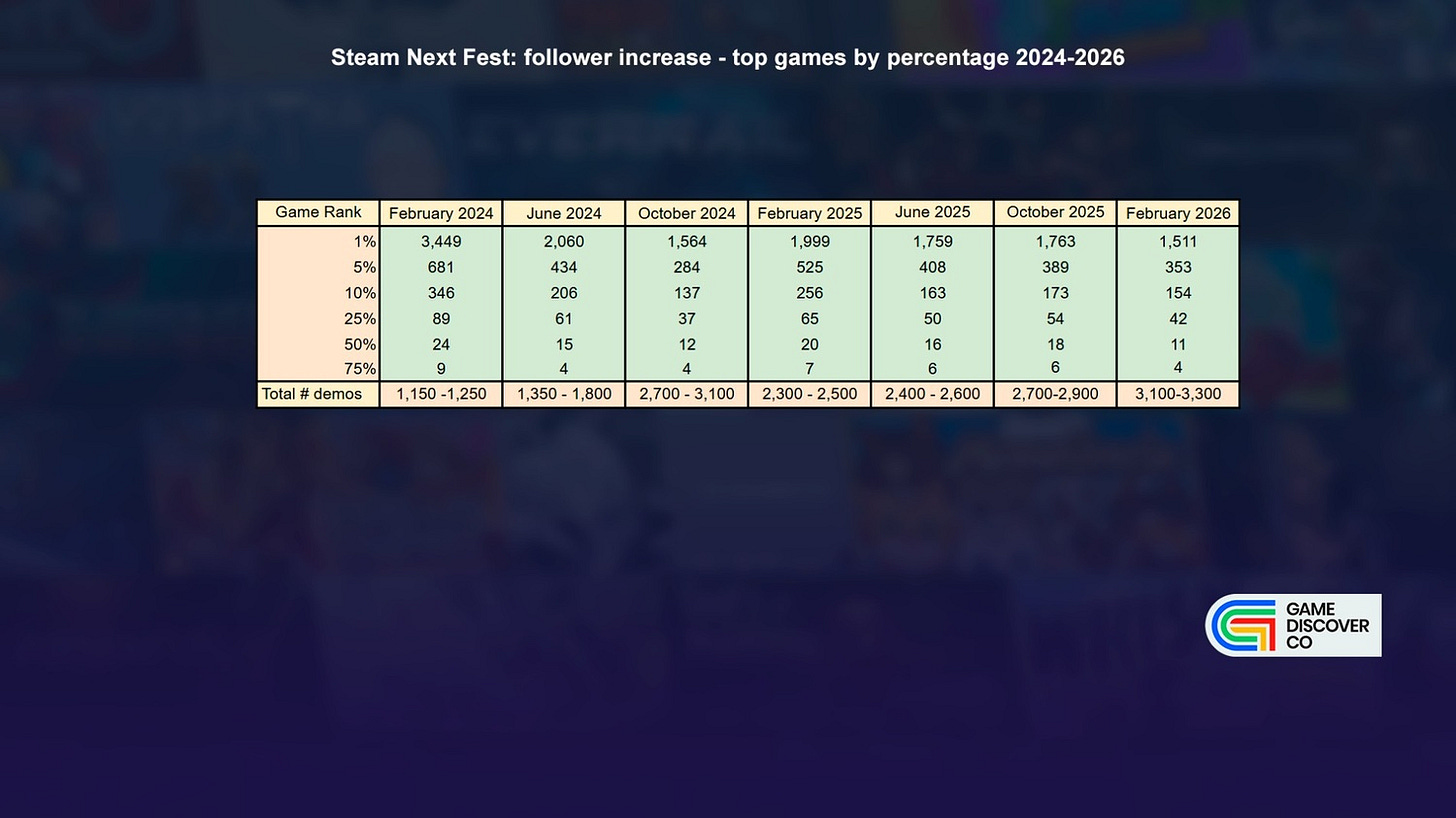 Secondly, we used Steam follower increase to look at how well certain percentages of games have been doing over the latest 6 Next Fests - if you’re in the Top 1%, Top 10%, etc. Results this time show continued % degradation as the # of demos goes up: