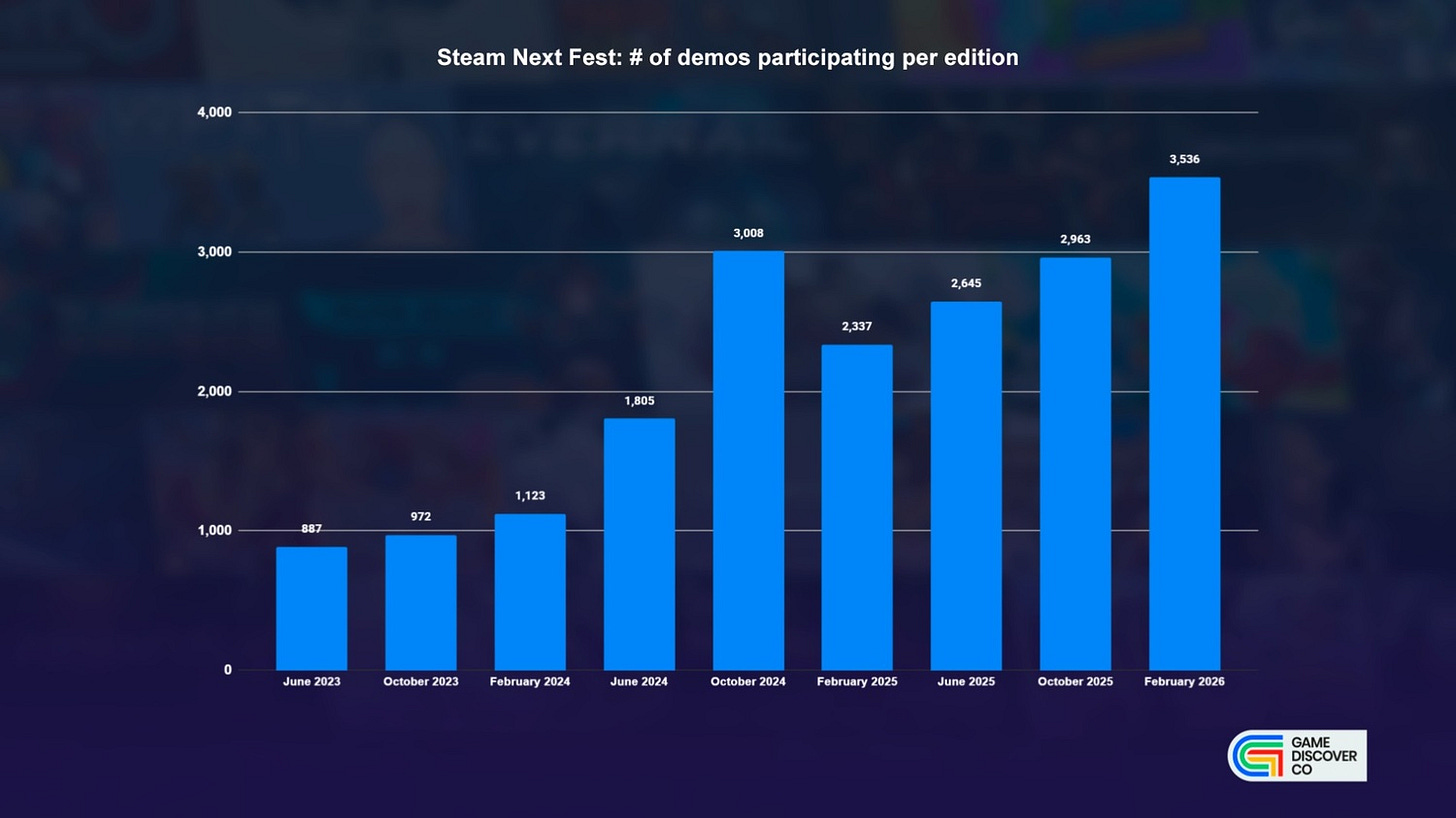 Finally, we’ll do the ‘trends’ thing. With regard to number of games, at >3,500 demos, the Feb. 2026 Next Fest is 19% up on October’s, and 51% up on last Feb’s Next Fest: