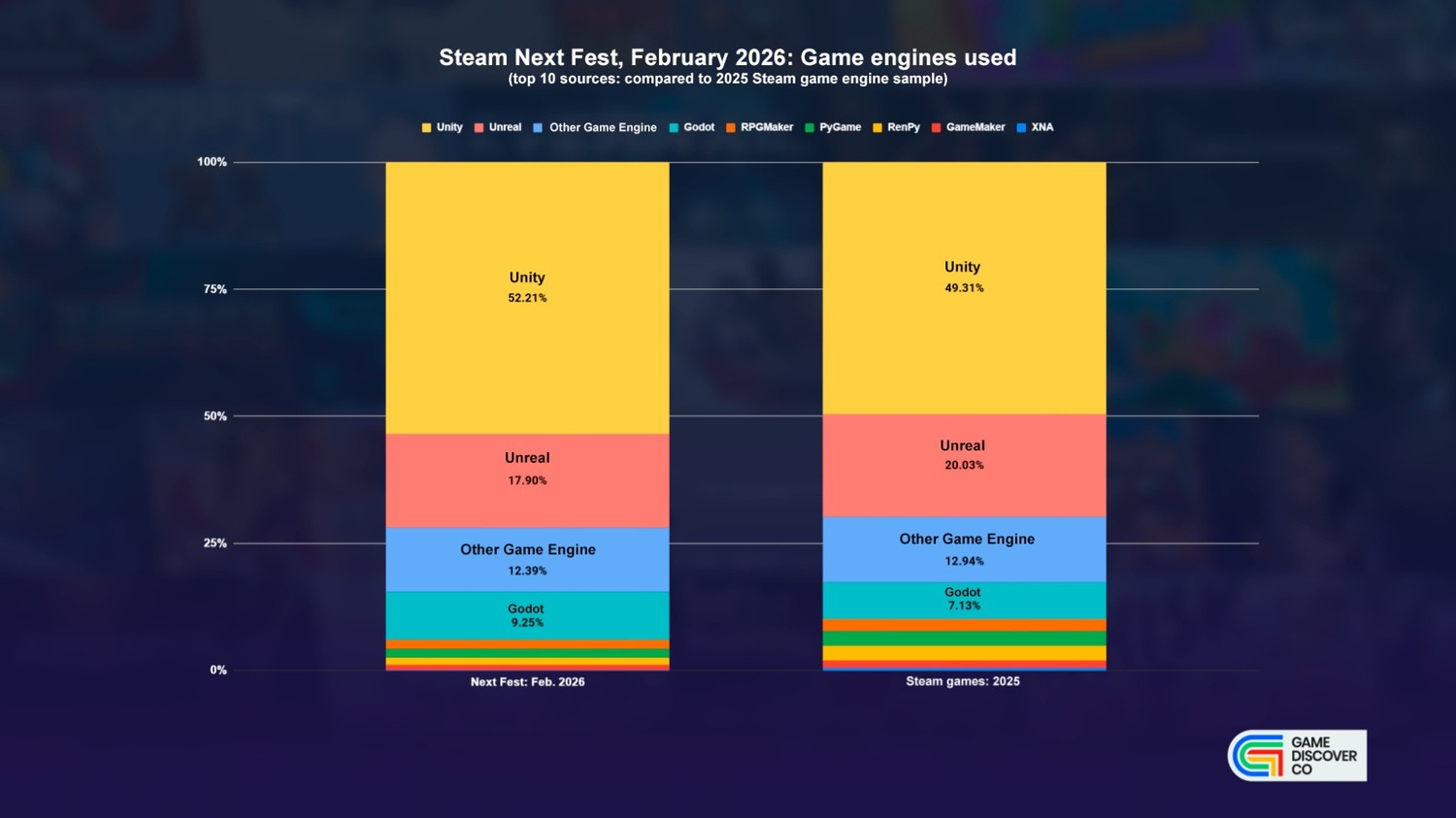 Compared to all Steam games we scanned in 2025, there’s more Unity and Godot, and less Unreal. But this is more about the make-up of smaller studios entering Next Fest than a major change in the Unity vs. Unreal market share. (Godot is def. on the way up, though.) We’ll do a big multi-year engine comparison article shortly…