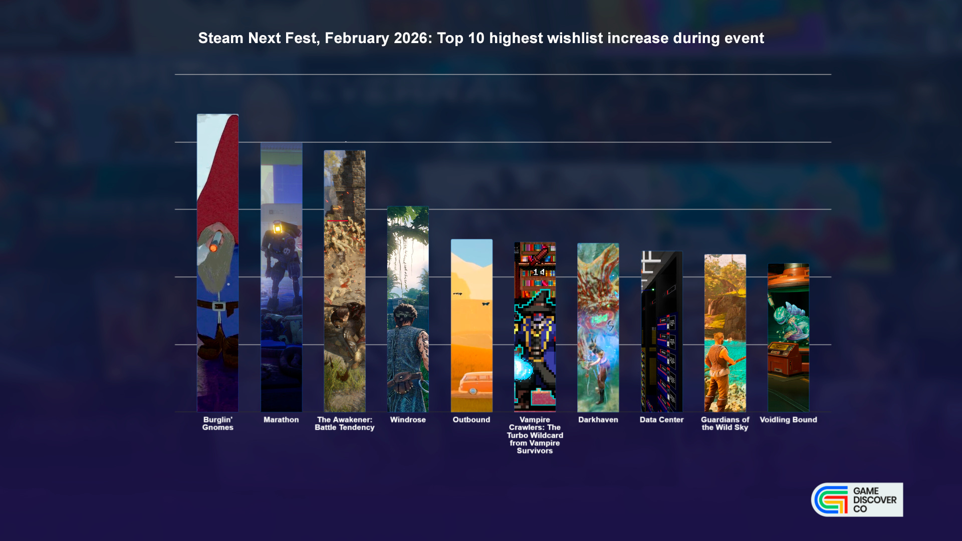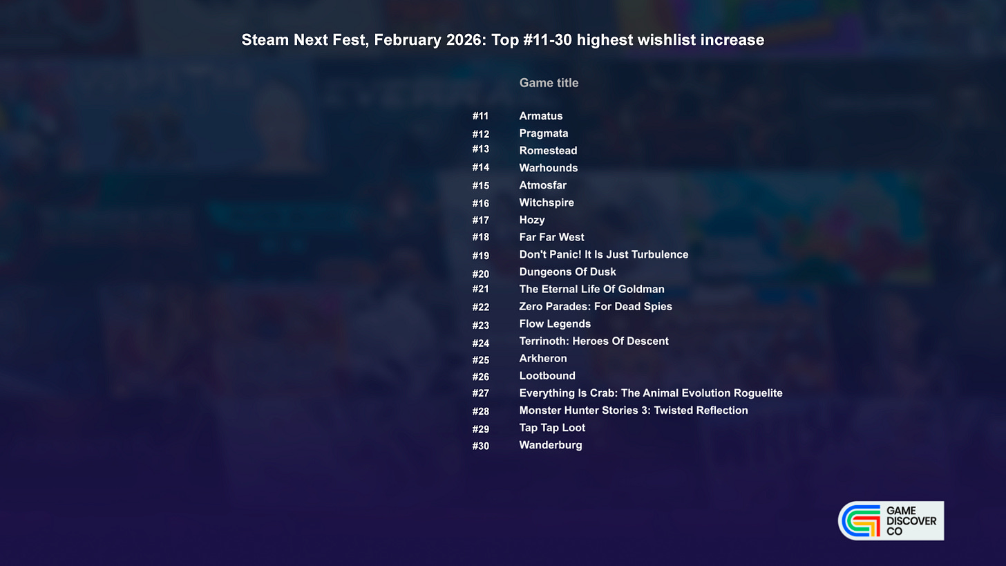 Next, let’s take a look at GDCo’s wishlist increase rankings during Feb’s Next Fest (above). You’ll see a lot of overlap (50%+) with the Top 10 from Valve, but some different titles: for example, the Dynasty Warriors-inspired The Awakener: Battle Tendency (#3) seems to have focused interest from China.