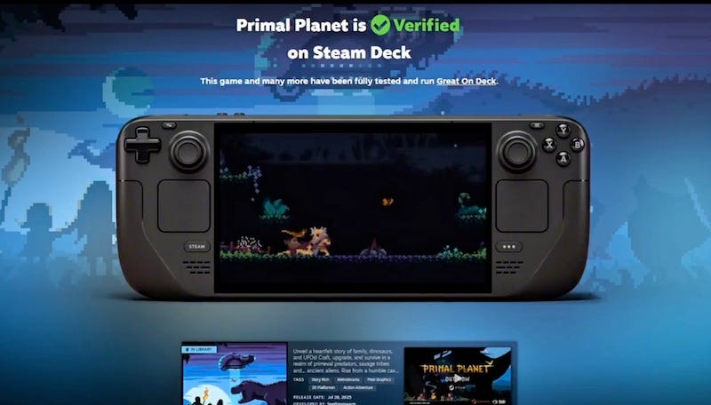 Valve just sent out a note to everyone with a Steam Deck Verified game, adding a special ‘Steam Deck verified’ store page for specific game, as noted by the Primal Planet folks. (It’s been used for Steam Deck main page ‘features’ before & you can modify Primal Planet’s URL by changing the AppID to see other Verified pages.)