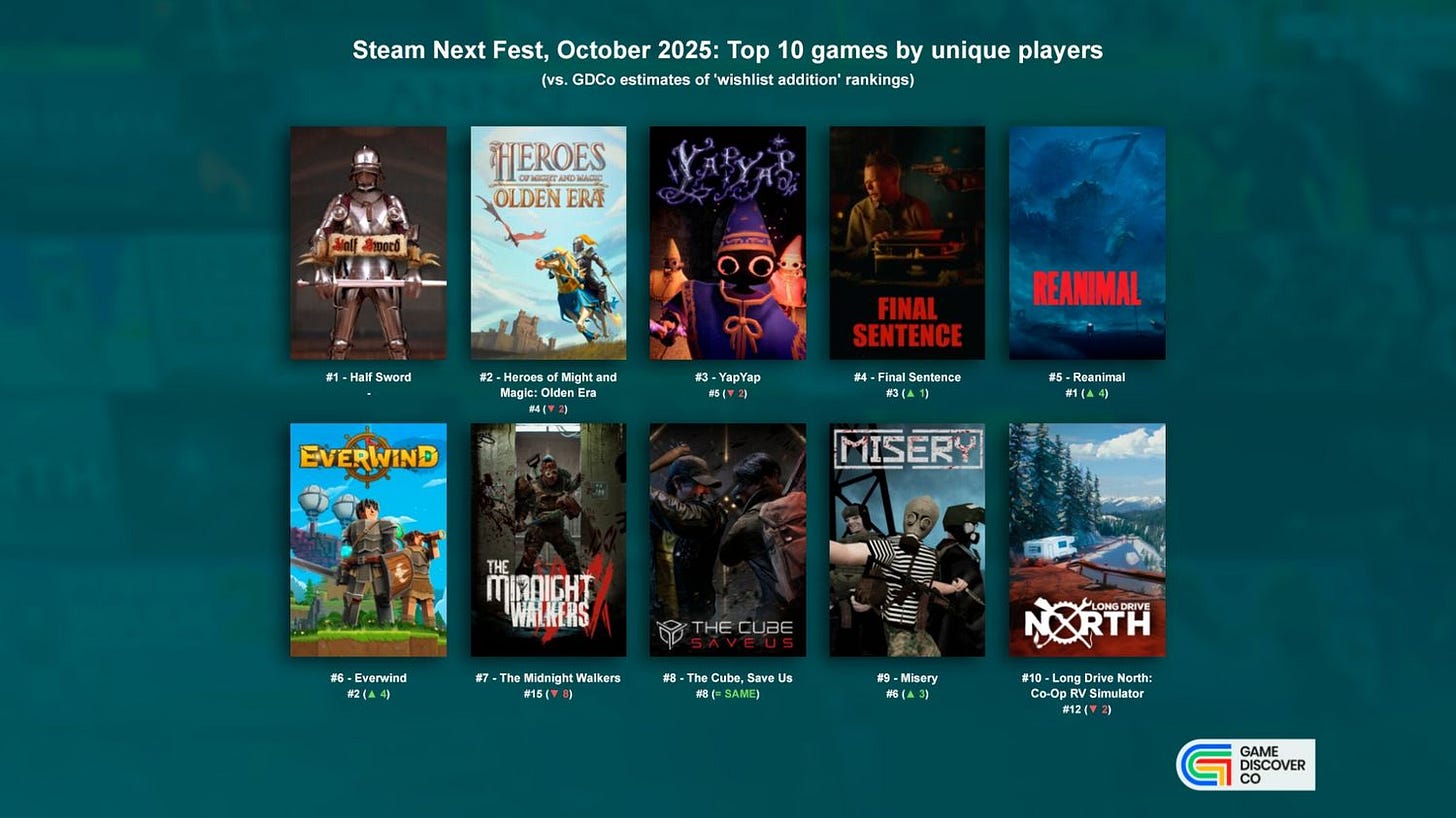In fact, Valve itself put out a Top 50 demos of Next Fest yesterday by unique players, not even randomized (like some of their charts!), something they didn’t do a couple of years ago. So this gives us a great comparison point to all the super-detailed data on every single Oct. 2025 Next Fest demo (Google Drive doc) we’ve once again pulled.