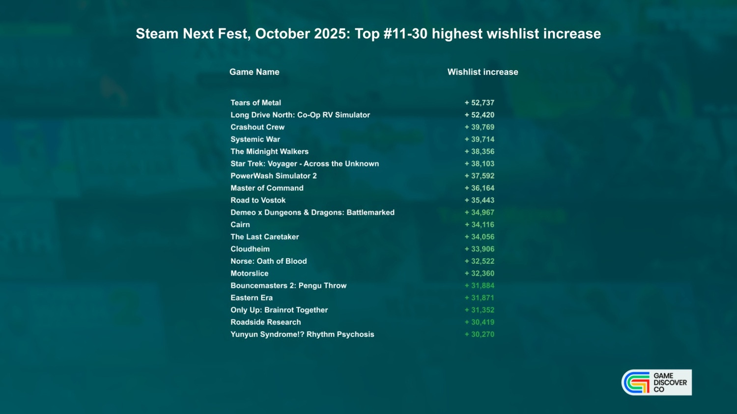 And here’s all of the Top 30. FYI; the two other games we estimate at >50k extra wishlists during Next Fest are medieval hack & slash co-op roguelike Tears Of Metal and co-op RV simulator Long Drive North - both of which had significant momentum coming into the Fest.